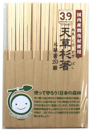 使って守ろう!日本の森林 国内産杉間伐材を使用した割り箸です!【国産】天草杉箸 元禄箸20膳価格: 141円レビュー評価: 5.0 レビュー数:1 使って守ろう!日本の森林 熊本産の杉間伐材を使った日本製の割り箸です。 安い輸入材に押されて国産材の利用が激減し、日本の人工林の多くは、下刈、間伐などの手入れが行き届かずに荒廃してます。 日常生活に国産材製品をもっと取り入れて、人工林の循環を助け、CO2をたっぷり吸収する元気な森をよみがえらせましょう。 質感のある紙を使った無地の箸袋もシンプルでかわいい♪消しゴムはんこなどでオリジナルの箸袋にアレンジするのもおすすめです♪ ●20膳入り サンキューグリーンマークとは 京都議定書で定められた日本の温室効果ガス削減目標?6%のうち、約3分の2に相当する3.9%*は森林による二酸化炭素吸収が担ってい |